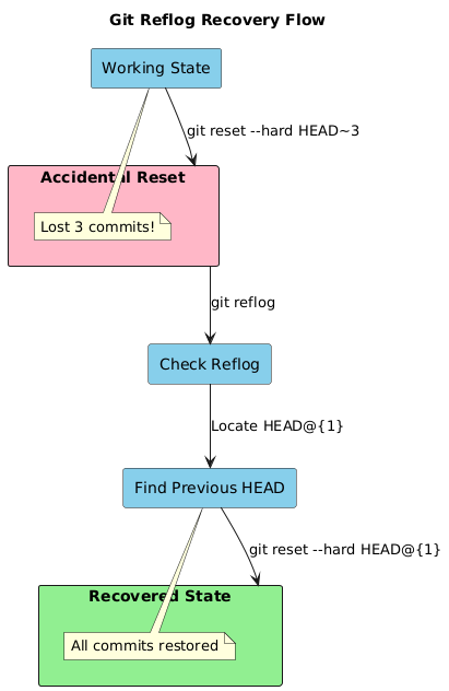 Git reflog shines brightest in moments of panic: when you've lost commits after a mistaken reset, need to recover work erased by an accidental rebase, or want to undo a problematic merge. Here are some of the most useful scenarios where reflog can help you recover quickly and safely: