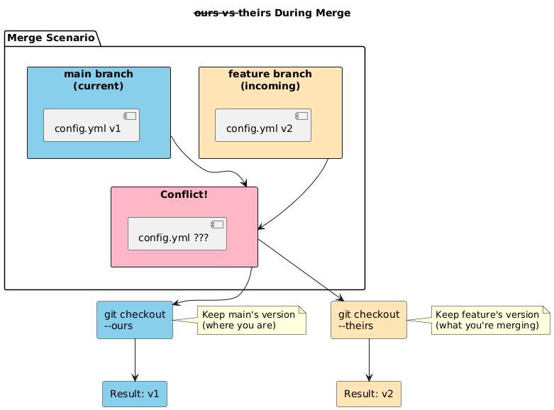 --ours= current branch (where you are)--theirs= incoming branch (what you're merging in)