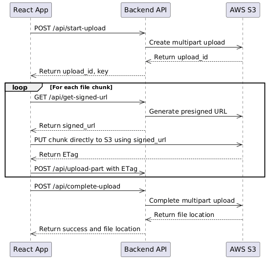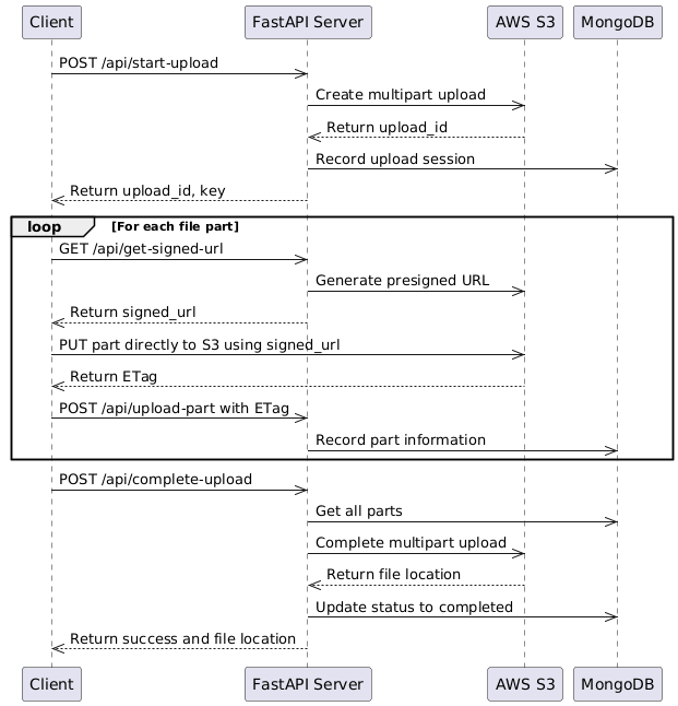 - Client: The client uploads each chunk directly to S3 using the signed URL.