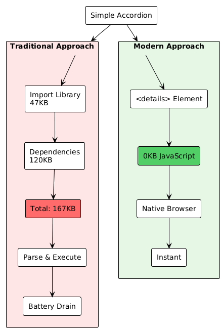 When we reach for third-party libraries to solve every UI or performance challenge, we often overlook the hidden impact—on both the user experience and the planet. Every unnecessary dependency inflates our bundles, slows interactions, drains batteries, and wastes precious device resources. Beyond the direct cost to your users, this bloat ripples outward, scaling inefficiency across millions of page loads. Let’s break down the tangible consequences of over-engineering with JavaScript compared to using the browser’s native capabilities.
