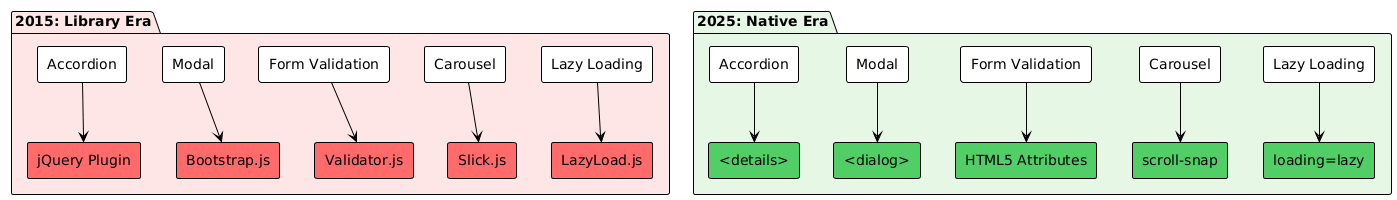 Modern HTML and CSS provide native solutions for problems that once required JavaScript: