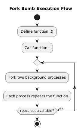 The fork bomb repeatedly forks two background processes, each of which repeats the function. This continues as long as system resources are available.