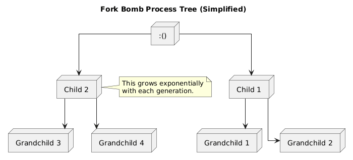 The process tree grows exponentially with each generation. The number of processes doubles with each level. Ultimately, this leads to a rapid depletion of system resources.