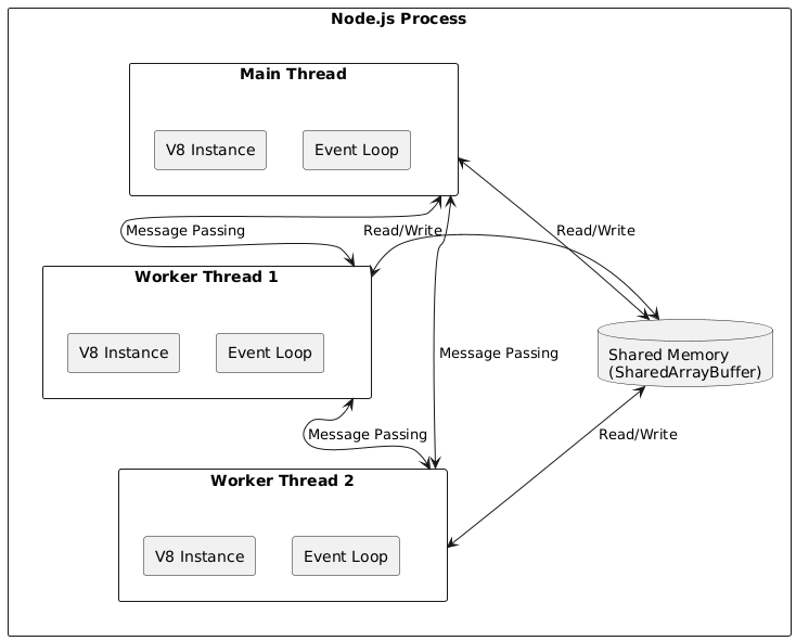 The diagram above shows how worker threads operate within a Node.js process. Each worker thread has its own V8 instance and event loop, allowing true parallel execution. Communication happens through message passing, and memory can be shared using SharedArrayBuffer.
