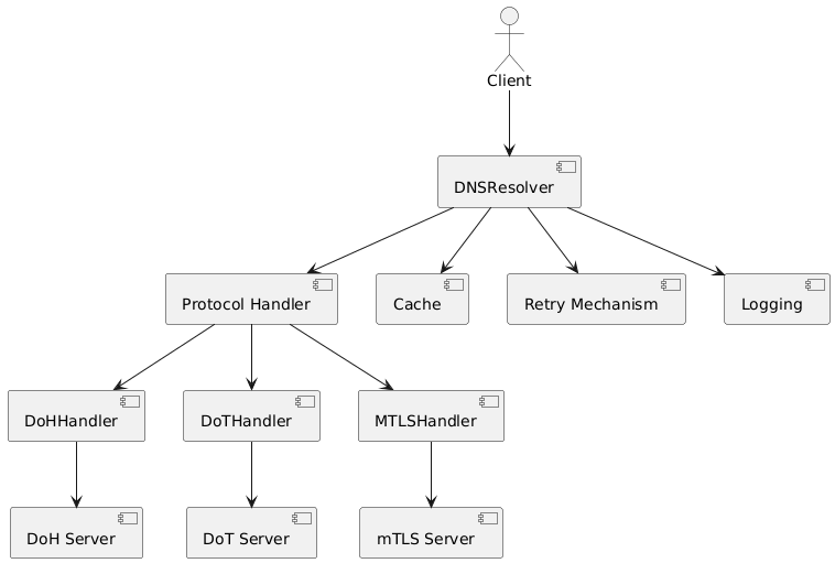- DNSResolver: The main class handling DNS queries. It maintains a registry of protocol handlers and delegates queries to the appropriate handler.