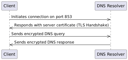 - Client Initiates Connection: The client makes a request to the DNS server over TCP, using port 853, which is reserved for DoT.