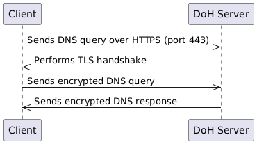 - Client Sends HTTPS Request: The client sends a DNS query in an HTTPS request to the DoH server, using port 443.
