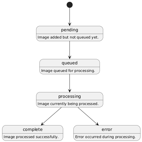 - Efficient State Management: Tracks image statuses (pending, queued, processing, complete, error).