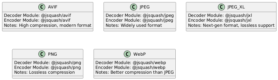 The Decoders package in Squash is responsible for encoding and decoding images using high-performance WebAssembly (WASM) modules. It supports multiple image formats—AVIF, JPEG, JPEG XL, PNG, and WebP—for fast and efficient image processing.