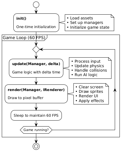 Your update() method runs at exactly 60 FPS with delta time support, while render() runs as fast as your hardware allows. The fixed timestep means buttery-smooth physics regardless of framerate drops.