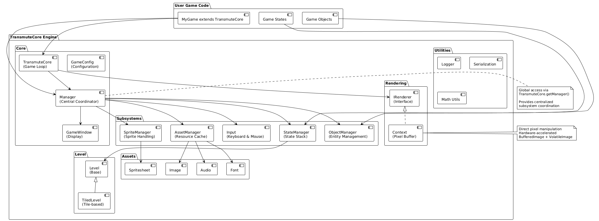 Transmute Core is designed around a central Manager system that coordinates all engine subsystems. This architecture keeps things organized while giving you direct access to every component when you need it.